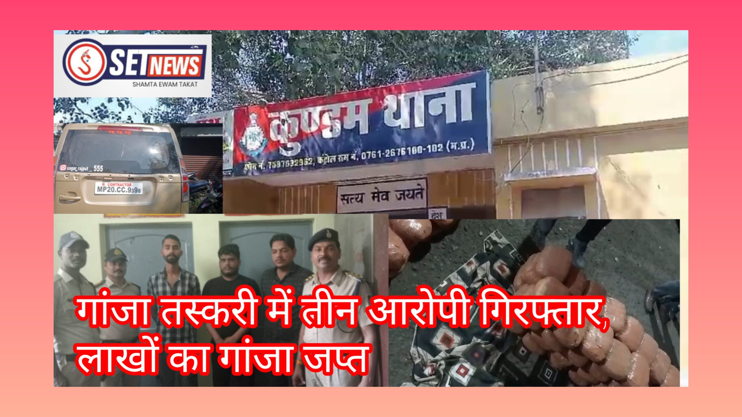 SET NEWS जबलपुर! कुंडम थाना पुलिस को बड़ी सफलता हाथ लगी है,जहा गांजा की तस्करी करने वाले तीन आरोपियों को गिरफ्तार किया है, जिनके कब्जे से लाखों रुपए का गांजा जप्त करने की कार्यवाही की गई है, जहां कुड़म थाना पुलिस से मिली जानकारी के मुताबिक विश्वसनीय मुखबिर से सूचना मिली थी कि,तीनो लोग चार पहिया वाहन महिन्दा जायलो गाड़ी क्रमाक एम पी 20 CC 9398 में मादक पदार्थ गांजा लेकर शहपुरा तरफ से कुडम होते हुऐ जबलपुर जा रहे है। जहां मुखबीर की सूचना पर उनि वीरेन्द्र सिंह उड़के, सउनि असवंत सिंह प्र.आर,भूपत पटेल विमल कुमार यादव, प्र.आर. बजेश लेकाम. प्र.आर. संतोष परस्ते आर, भारत नरेंती में थाना पुलिस की टीम घेराबंदी करते हुए आरोपियों को गंजा ले जाते हुए गिरफ्तार किया है,नाम पता पूछा तो उन तीनों ने अपना नाम क्रमश (1) विजय कुशवाहा पिता संतोष कुमार कुशवाहा उम्र 32 साल निवासी करौदा सीओडी रोड यादव मोहल्ला राझी थाना राझी जिला जबलपुर 2 मोहित ठाकुर (परिहार) पिता राजेन्द्र प्रताप सिंह ठाकुर उम्र 24 1 वर्ष निवासी जुझारी उमरिया थाना मझौली जिला जवलपुर 3 एव वाहन चालक शियम उर्फ सागर ठाकुर (राजपूत) निवासी पोला रोड मझौली थाना पिता हरिसिंह ठाकुर उम्र 22 साल मझौली जिला जबलपुर का निवासी बताया फिलहाल पुलिस ने आरोपियों के कब्जे से 52 किलो गांजा जप्त करते हुए आरोपियों के विरुद्ध मामला दर्ज किया है और आरोपियों से पूछताछ की जा रही है