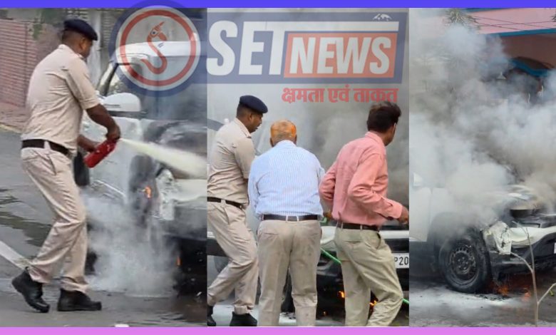 चलती ब्रेजा कार में भड़की आग, पुलिस की तत्परता से टला बड़ा हादसा -पुलिस कप्तान संपत उपाध्याय की टीम ने फायर एक्सटिंग्विशर से पाया काबू, चालक सुरक्षित