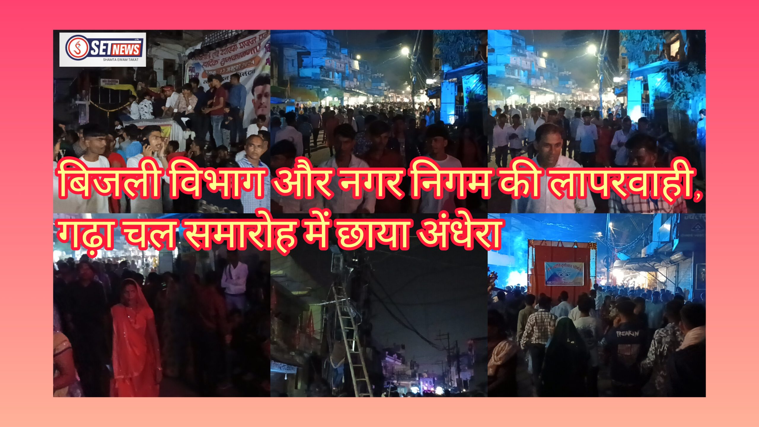 SET NEWS जबलपुर के मशहूर गढ़ा चल समारोह में बिजली विभाग की एक बड़ी लापरवाही देखने को मिली है, चल समारोह के दौरान लाखों की संख्या में लोग चल समारोह देखने के लिए पहुंचे हैं लेकिन इसी बीच बीटी तिराहा से आनंदकुंज क्षेत्र की आधी से ज्यादा बिजली बंद है, जिसके चलते चल समारोह देखने पहुँचे लोगो को काफी दिक्कतों का सामना करना पड़ा, साथ ही बिजली न होने की वजह से आने जाने वाले लोगों के जब भी कट गई, दशहरा घूमने के लिए निकली लोगों का कहना है कि पिछले डेढ़ घंटे से बिजली नहीं है जिसके चलते उन्हें काफी परेशानी हो रही है। प्रतिवर्ष काफी संख्या मे इस चल समारोह को देखने के लिए पहुंचते हैं, लेकिन इसके बावजूद भी बिजली विभाग व्यवस्था दुरुस्त नही हुई,