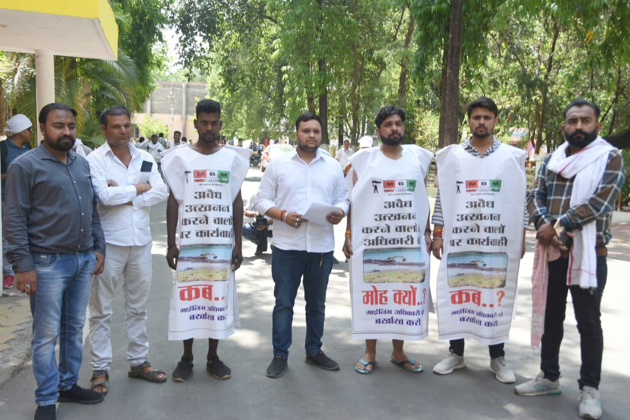 पहनकर जिसमे माइनिंग अधिकारी के बर्खास्त की मांग और अवैध खनन का चित्र बना हुआ था, जिसे पहनकर कलेक्टर कार्यालय ज्ञापन लेकर पहुचे और माइनिंग अधिकारी के बर्खास्तगी की मांग की। वही मोर्चा अध्यक्ष सौरभ यादव ने बताया कि मोर्चा के सदस्यों ने कई बार अवैध खनन और नियम विरुद्ध चल रही मशीनों के ऊपर करवाही की मांग की। लेकिंन अधिकारी के कानो में जंु तक नही रंेगी, मोर्चा ने माइनिंग अधिकारी पर गम्भीर आरोप लगाया है कि उनकी माफियाओ से साठगांठ है इसलिए कोई भी कर्रवाई अवैध माइनिंग के खिलाफ नहीं कह गई। जिससे नाराज होते हुए मध्य भारत मोर्चा के पदाधिकारियों ने अनोखे ढंग से अपनी बात रखते हुए अधिकारी को हटाने की मांग कि है।