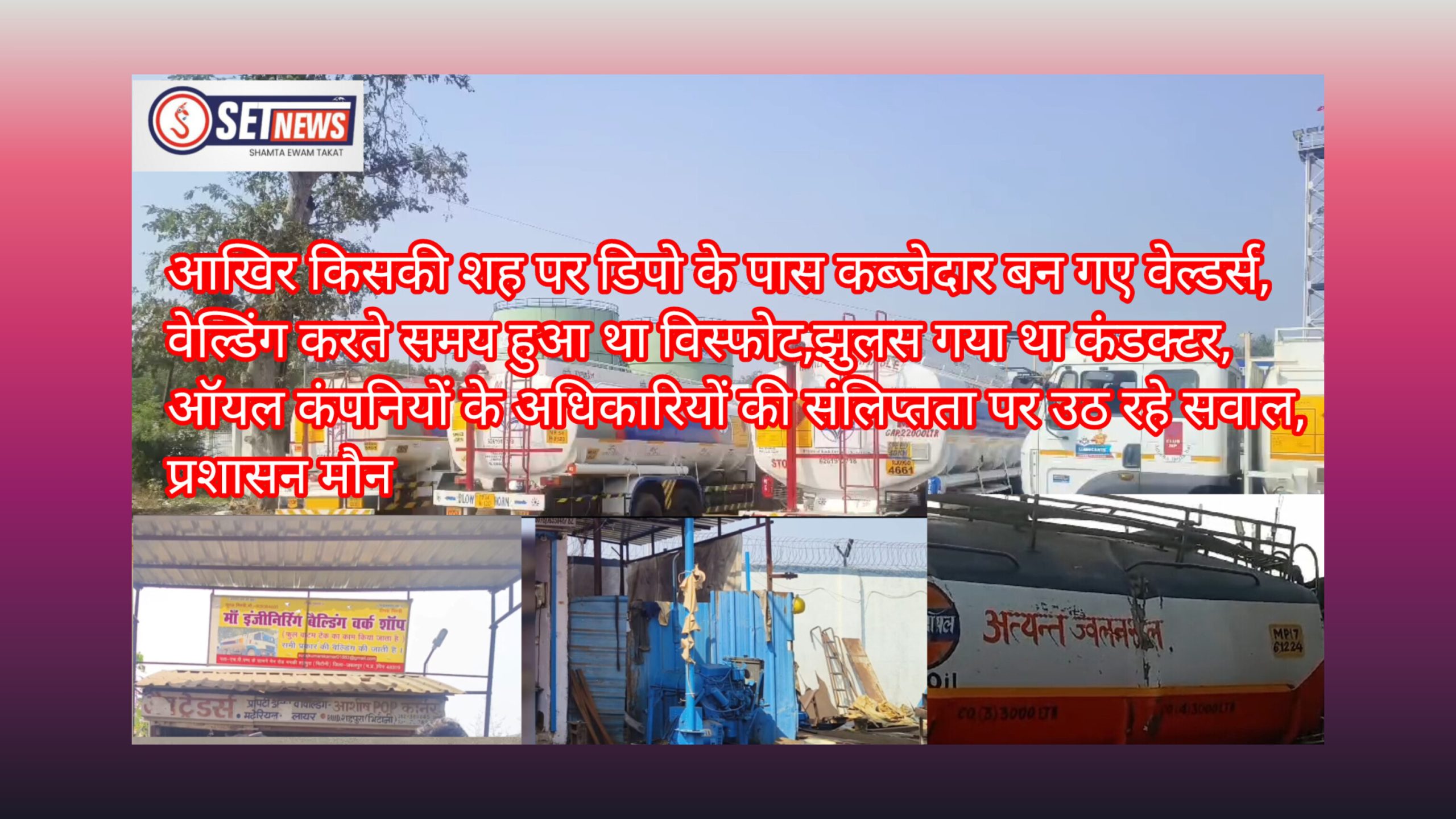 SET NEWS,जबलपुर। शहपुरा स्थित हिंदुस्तान पेट्रोलियम, इंडियन ऑयल और एलपीजी जैसी नामी कंपनियों के पेट्रोलियम डिपो एरिया में आखिरकार किसकी शह पर वेल्डर्स ने कब्जा जमा रखा है। यह सवाल अब क्षेत्रीय नागरिकों में चर्चाओं में सुलगने लगा है। सूत्रों के मुताबिक बताया जाता हैं कि उक्त कब्जेदार वेल्डर्स कुकुरमुत्तों की तर्ज पर गाहे-बगाहे सड़क किनारे टीन के शेड बनाकर अपनी दुकानदारी संचालित कर रहे है। इतना ही नहीं डिपो से निकलने पर उनको पहले ही बता दिया जाता है कि किस मिस्त्री के पास उनको वेल्डिंग के लिए जाना है। यह बात सामने आने के बाद ऑयल कंपनियों के अधिकारी-कर्मचारियों की संलिप्तता पर सवालिया निशान खड़े कर रहे है।