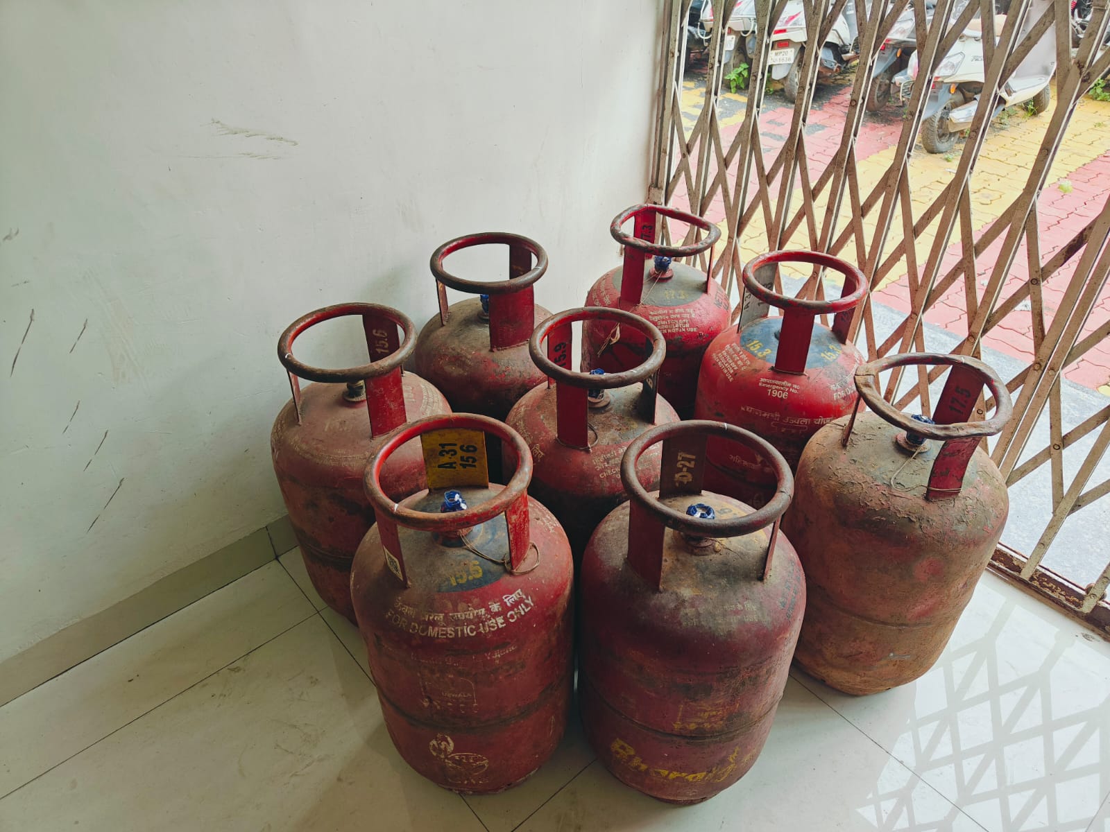 08 घरेलू गैस सिलेण्डर, 1 इलेक्ट्रानिक तराजू , गैस रिफ्लिंग पाईप, रेग्यूलेटर नोजल सहित तथा गैस रिफलिंग के नगदी रूपये जप्त
