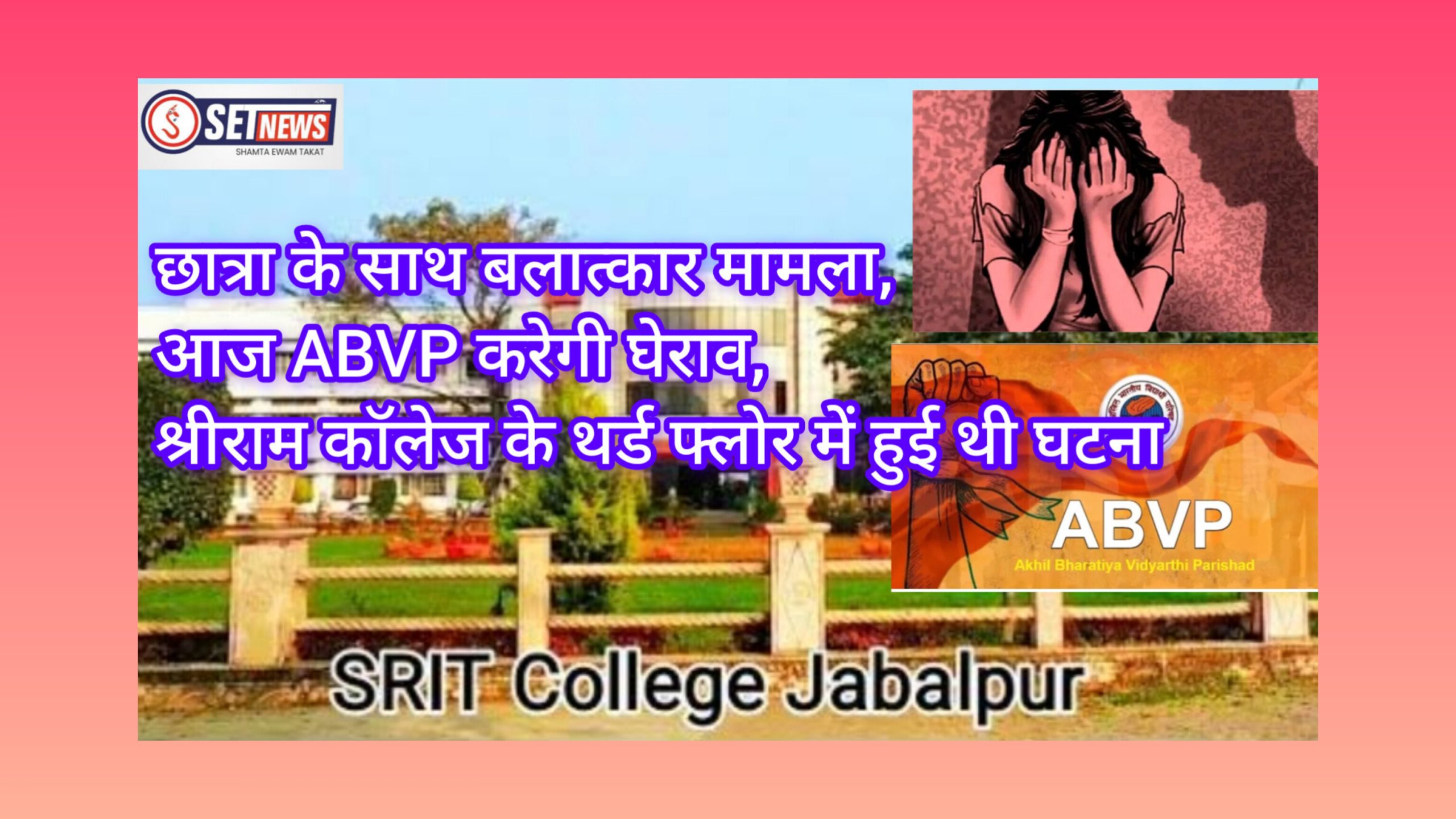 SET NEWS, जबलपुर। श्री राम कॉलेज के तीसरे फ्लोर में छात्रा के साथ हुए बलात्कार का मामला अब थमने की जगह तूल पकड़ता जा रहा हैं। दरअसल लव जिहाद से जुड़े इस मामले को दबाने के लिए कॉलेज प्रबंधन भले एड़ी चोटी का जोर लगा रहा हैं। लेकिन सत्तारूढ़ पार्टी से जुड़ी ABVP (अखिल भारतीय विद्यार्थी परिषद) कॉलेज प्रबंधन के खिलाफ खुलकर सामने आ गई हैं। इसी तारतम्य में आज सोमवार दोपहर 12 बजे उक्त घटना की जांच व कार्यवाही हेतु कॉलेज का घेराव कर प्रदर्शन किया जाएगा।