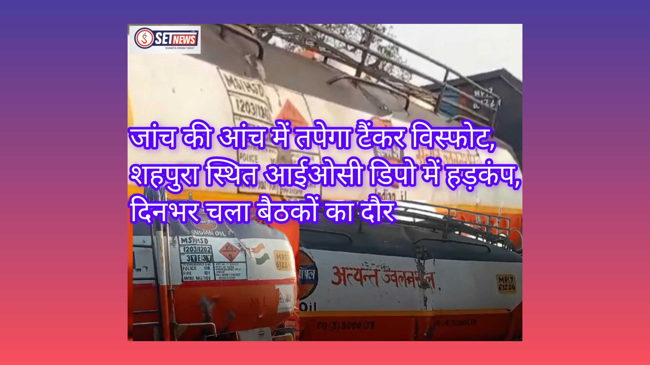 SET NEWS जबलपुर। पेट्रोलियम डिपो एरिया में टैंकर विस्फोट को लेकर इंडियन ऑयल कॉरपोरेशन (आईओसी) ने इस घटना पर सख्त रुख अपनाया है। भोपाल ऑफिस ने पूरे मामले में घटना का कारण और उसमें कौन-कौन दोषी है इसकी जांच कर रिपाेर्ट तलब करने के निर्देश दिए है। वहीं सोशल मीडिया में पेट्रोल-डीजल कटिंग करते हुए वायरल हुए वीडियो को लेकर कंपनी के अधिकारी बुधवार को पुलिस कप्तान संपत उपाध्याय से मिले और दोषियों पर कार्रवाई का आग्रह किया।