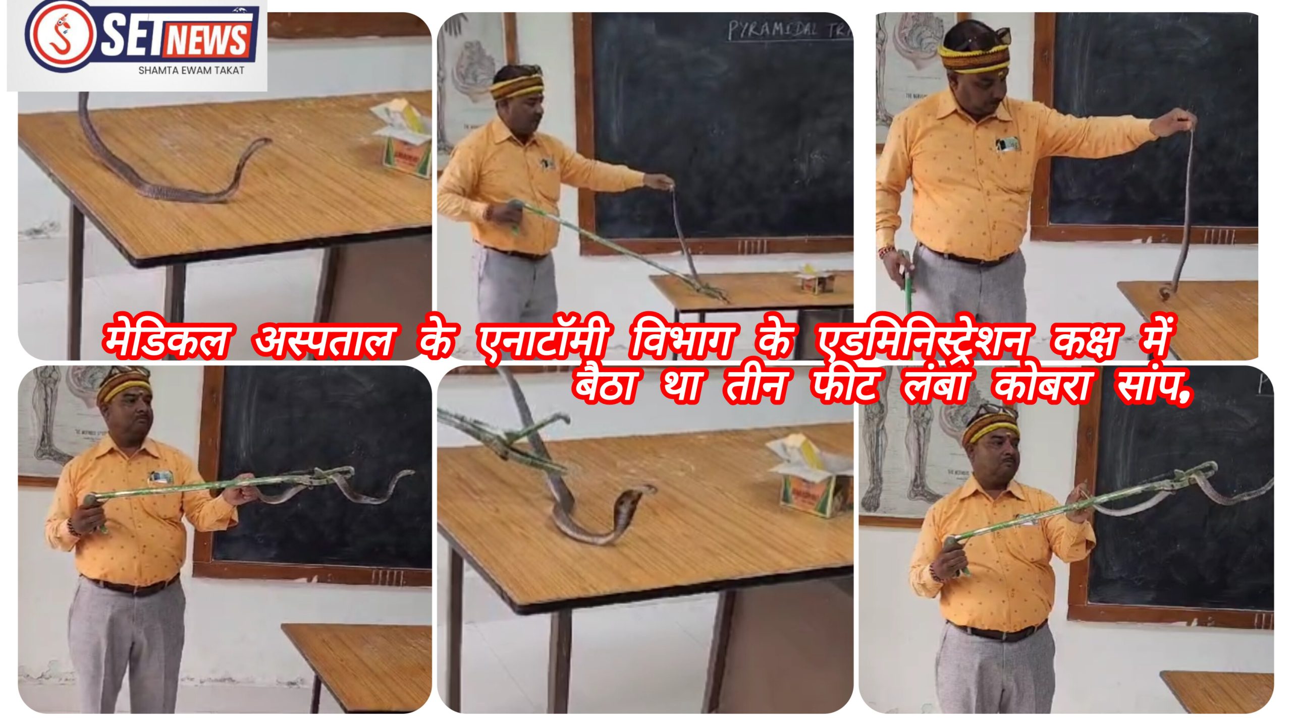 जबलपुर सेट न्यूज ! मेडिकल कॉलेज अस्पताल के एनाटॉमी विभाग के एडमिनिस्ट्रेशन कक्ष में सुबह ग्यारह बजे जब छात्र छात्राओं की क्लास चल रही थी तभी एक छात्रा की नजर बेंच के नीचे फन फैलाकर बैठे सांप पर पड़ी तो वह चीख पड़ी जिस तरह पर क्लास ले रहे प्रोफेसर डॉ सुनील अग्रवाल ने सभी छात्र/छात्राओं को बिना शोर किये तत्काल कक्ष से बाहर निकाल कर सर्प विशेषज्ञ गजेंद्र दुबे को सूचना दी जिन्होंने मौके पर पहुंचकर रेस्क्यू करते हुए सांप को पकड़कर जंगल में छोड़ दिया। पकड़ा गया सांप कोबरा प्रजाति का नाग है।जो अभी छोटा है किन्तु ये सर्प जन्म से ही जहरीला होता है।