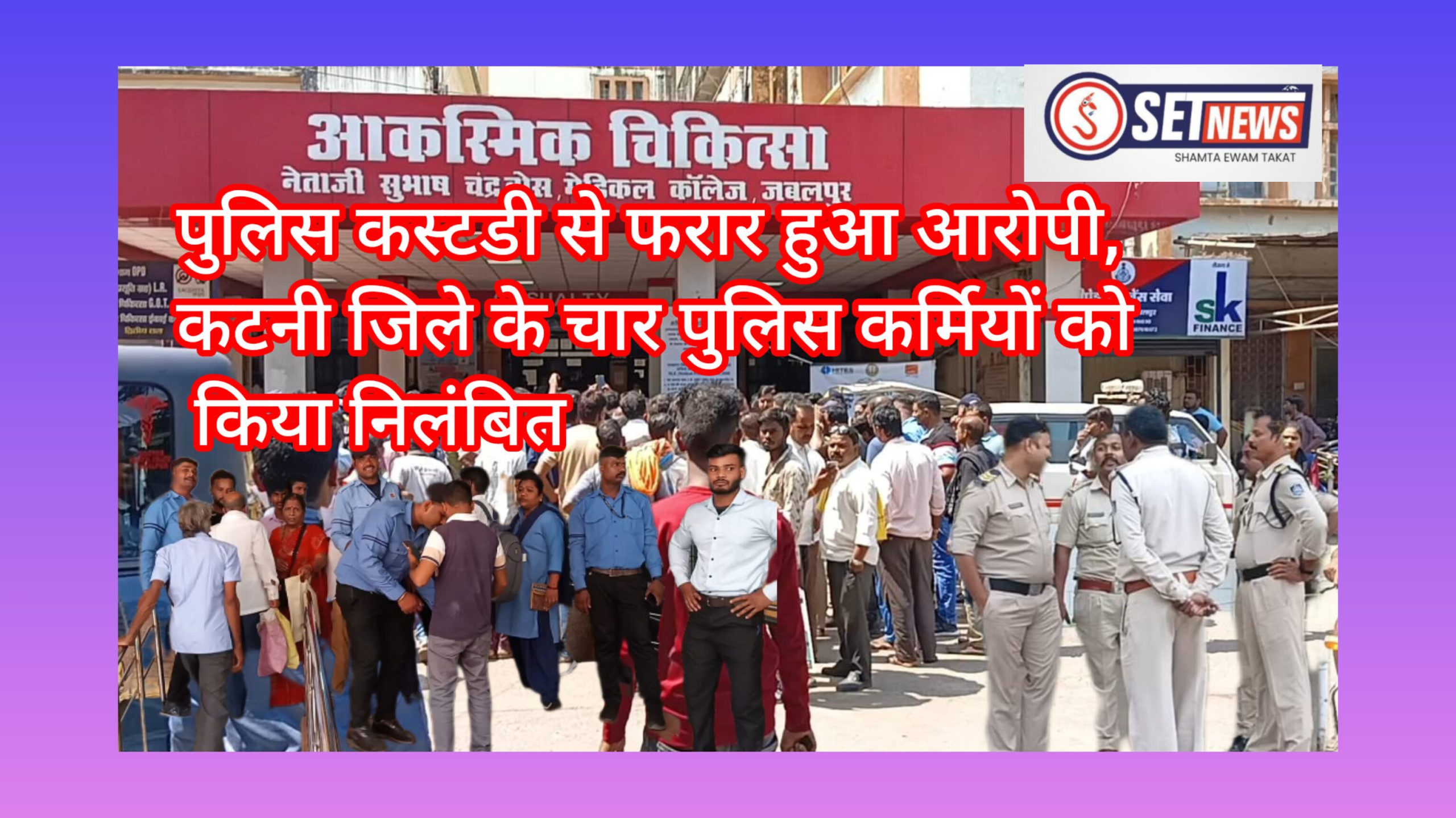 SET NEWS जबलपुर!  जबलपुर के नेताजी सुभाष चंद्र बोस मेडिकल अस्पताल में एक बार फिर बड़ी लापरवाही सामने आई है जहां पुलिस कस्टडी से एक आरोपी इलाज के दौरान हथकड़ी खोलकर फरार हो गया, मेडिकल अस्पताल में इतनी सुरक्षा व्यवस्था होने के बावजूद भी आरोपी कैसे फरार हो गया चैनल गेट बंद है और जगह-जगह पर सिक्योरिटी गार्ड और बाउंसर मौजूद रहते हैं साथ ही पुलिस बल भी तैनात रहा इसके बाद भी आरोपी पुलिस की कस्टडी से मौका देखकर फरार हो गया घटना की जानकारी लगने के बाद मौके पर पहुंची पुलिस ने गढ़ा थाने में शिकायत दर्ज कराया और फरार आरोपी की तलाश की जा रही है, जानकारी के मुताबिक बताया जा रहा है कि आरोपी संतु और से छोटू भूमिया पिता परमलाल भूमिया उम्र 21 साल निवासी ग्राम राखी थाना स्लीमानाबाद जिला कटनी का निवासी था जो जिला जेल कटनी में 498 ए 304 बी,34,3/4 दहेज प्रतिषेघ बंदी था जिसकी तबीयत खराब होने पर उसे कटनी से जबलपुर के नेताजी सुभाष चंद्र बोस मेडिकल अस्पताल में रेफर किया गया था जो कल दिनांक शाम 5:00 बजे मेडिकल अस्पताल से पुलिस कस्टडी से फरार हो गया जहां आरोपी के फरार होने के बाद सुरक्षा में लगाए हुए पुलिसकर्मियों को प्रधान आरक्षक दिनेश रजक आरक्षक अमित सिंह आरक्षक जयंत कोरी आरक्षक राजेश को निलंबित कर दिया गया है और फरार आरोपी की तलाश की जा रही है,,,,,