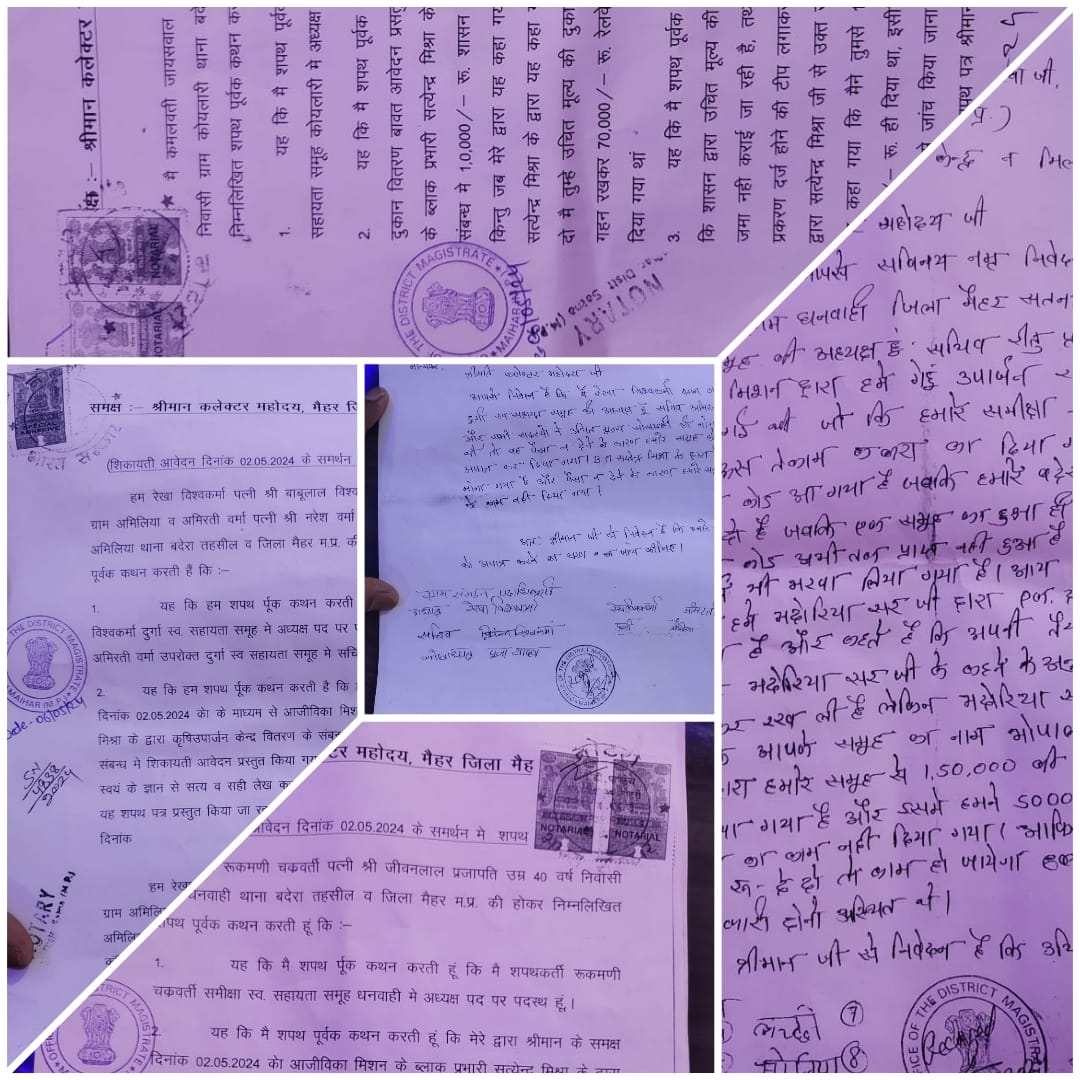 मैहर जिले में इन दिनों स्व सहायता समूह की महिलाओं ने आजीविका मिशन के ब्लॉक प्रभारी के खिलाफ मोर्चा खोल दिया है, महिलाओं का आरोप है कि खाद्य विभाग से सांठगांठ बिठाकर खरीदी केंद्र और शासकीय उचित मूल्य की दुकान के आवंटन में सप्तेंद्र मिश्रा ने महिलाओं को ठगा है।जानकारी के अनुसार स्व सहायता समूह की ग्रामीण क्षेत्र की महिलाओं के खाते से लोन निकलवाया गया कही महिलाओं ने गहने गहन रखवाए गए और जिले के वरिष्ठ अधिकारियों के नाम सप्तेंद्र मिश्रा ने महिलाओं को खरीदी केंद्र और शासकीय उचित मूल्य की दुकान दिलाने के नाम पर लाखो रुपए लिए है,जिसकी शिकायत महिलाओं ने शपथ पत्र सहित जिला कलेक्टर मैहर को सौंपी है।धीरे धीरे महिलाओं का समूह एकत्रित होते जा रहा है,सूत्रों का दाबा है कि उक्त व्यक्ति ने वरिष्ठ अधिकारियों के नाम पर करीब 10 लाख रुपए की रिश्वत ली है! जिन्हे खरीदी केंद्र मिला है जिन्हे शासकीय उचित मूल्य की दुकान मिली है और जो लेने के इच्छुक थे आवेदन किए थे सभी स्व सहायता समूह की महिलाओं से पैसे लेने का दायित्व सप्तेंद्र ने संभाला है, जिनके कार्य पैसे देने के बाद नही हुआ उन्होंने अब मोर्चा खोल दिया है वही जो रकम ज्यादा दिए उनकी सांठगांठ सप्तेंद्र द्वारा बनवा दी गई,उच्च स्तर में मामले की अगर जांच हो तो करीब 4माह के अंदर कई लाख का रिश्वत कांड बाहर आ जायेगा| आजीविका मिशन से जुड़ी महिलाओं ने कलेक्टर श्री मती रानी बाटड़ कों पत्र लिखकर दोषी ब्लाक प्रभारी के खिलाफ उचित कार्रवाई किए जाने का अनुरोध किया है।