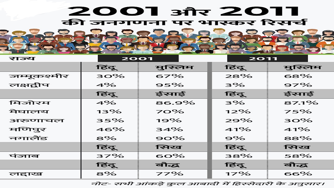 सुप्रीम कोर्ट में भाजपा नेता ने याचिका दायर करके कम आबादी वाले राज्यों में हिंदुओं को अल्पसंख्यक घोषित करने की मांग की है। इसके बाद से ही इस पर राजनीतिक गहमागहमी का दौर शुरू हो गया है। इसके बीच में भास्कर ने 2001 और 2011 की जनगणना पर रिसर्च किया तो चौकाने वाली जानकारी सामने आई है। कम आबादी वाले 9 राज्यों में से 6 में हिंदुओं की आबादी घटी है। वहीं, जिस पंजाब में सिख बहुसंख्यक हैं, वहां उनकी आबादी दो प्रतिशत कम हुई और लद्दाख के बहुसंख्यक बौद्ध 9 प्रतिशत कम हुए हैं।
