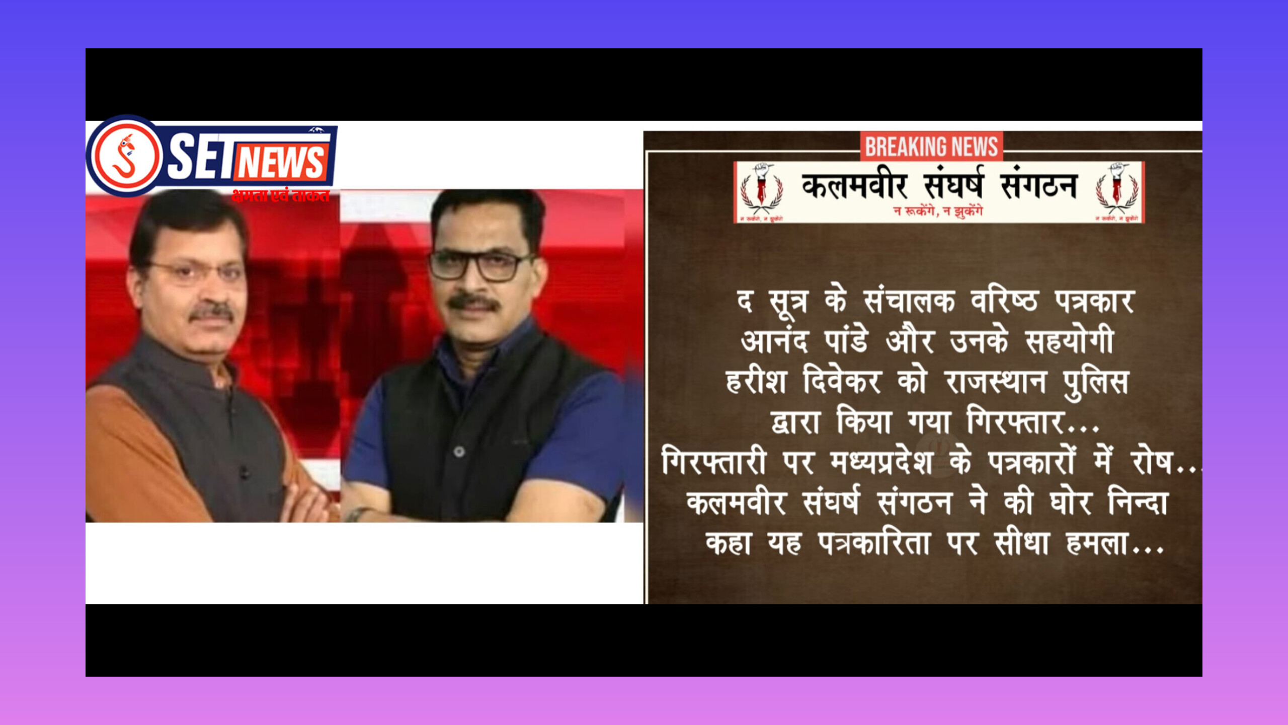 SET NEWS, भोपाल। पत्रकारिता पर हमला करने वाली हर सत्ता को जवाब मिलेगा — यह संदेश अब सड़कों से सोशल मीडिया तक गूंज रहा है। राजस्थान पुलिस ने डिजिटल प्लेटफॉर्म ‘The सूत्र’ के दो संपादकों हरीश दिवेकर और आनंद पांडे को मध्यप्रदेश के इंदौर से उठा लिया, जिससे पूरे मीडिया जगत में आक्रोश फैल गया। यह कार्रवाई राजस्थान की डिप्टी सीएम दीया कुमारी से जुड़ी कुछ खबरों को लेकर मानी जा रही है।